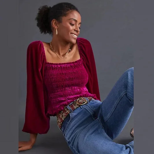Anthropologie Velvet Smocked Puff Sleeve Top