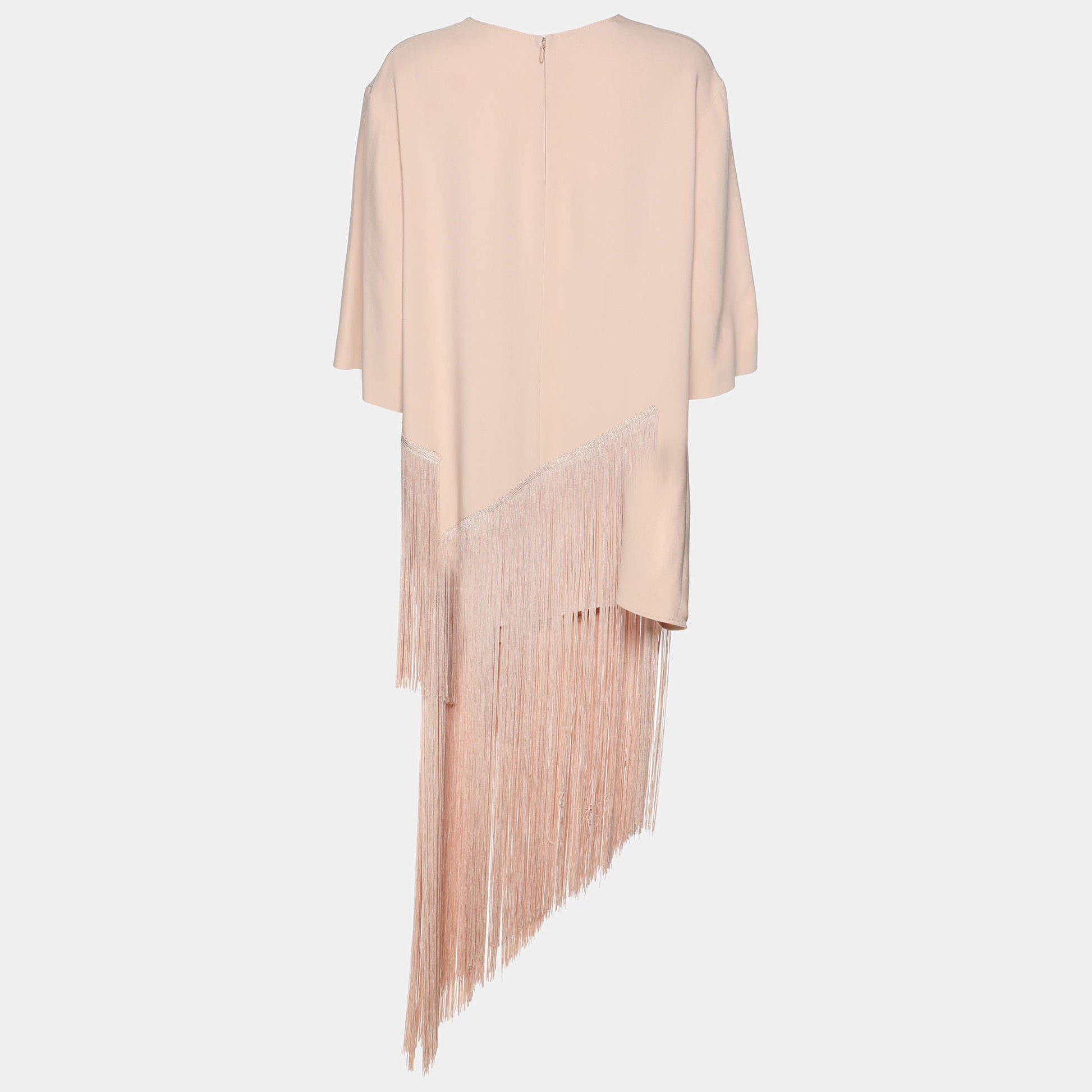 Elevate your wardrobe with this Stella McCartney designer top, a perfect balance of modern minimalism and playful movement. Crafted from a soft peach crepe blend, this top drapes effortlessly while cascading fringe details create dynamic flow with every step. Chic, feminine, and unmistakably Stella, it’s a standout piece that transitions seamlessly from day to evening.